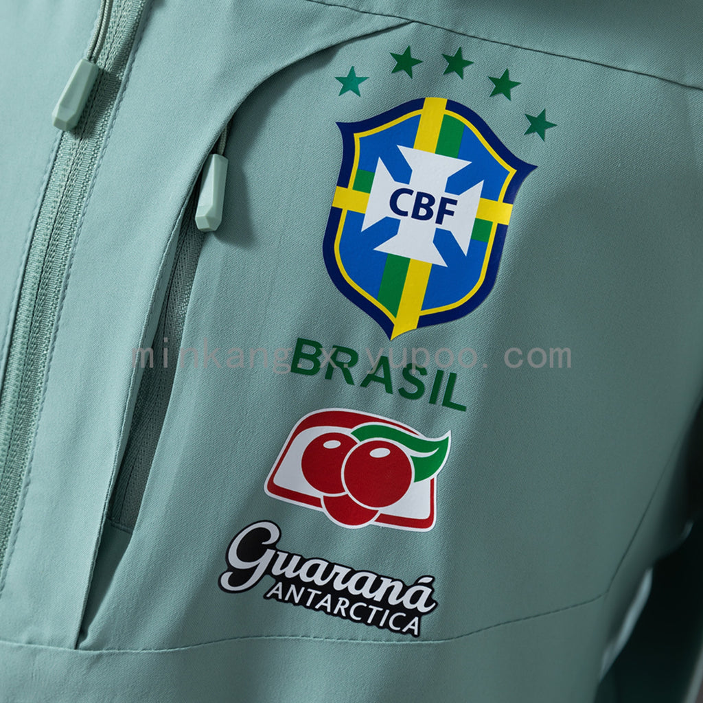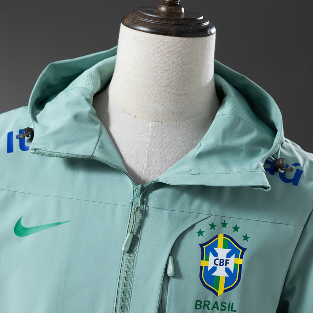 Produzida com material leve e resistente ao vento, a jaqueta oferece proteção em dias mais frescos sem perder o conforto. O design em verde claro traz um visual diferenciado e elegante, enquanto o escudo do Brasil em destaque reforça o estilo esportivo da peça.
